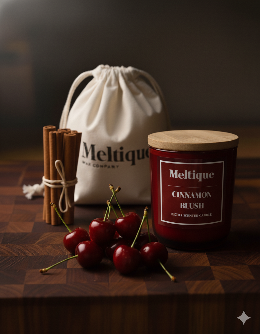 Wrap your senses in the comforting embrace of Cinnamon Blush, a richly scented candle by Meltique. This elegant red glass jar holds a perfectly balanced fragrance that blends warm cinnamon spice with the sweet, juicy aroma of red cherries, creating an inviting and indulgent scent experience.